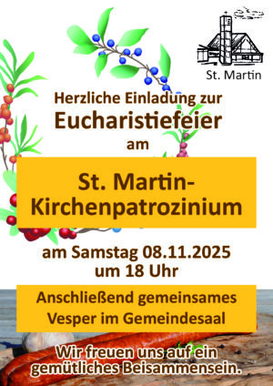 Eucharistiefeier zum Kirchenpatrozinium St. Martin, anschl. gemütliches Beisammensein mit Vesper Datum und Zeit Sa., 08.11.202518:00 Ort St. Martin